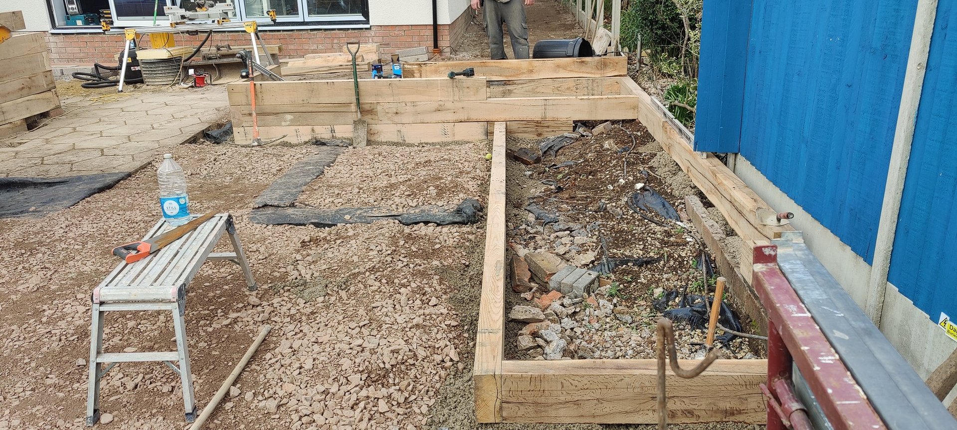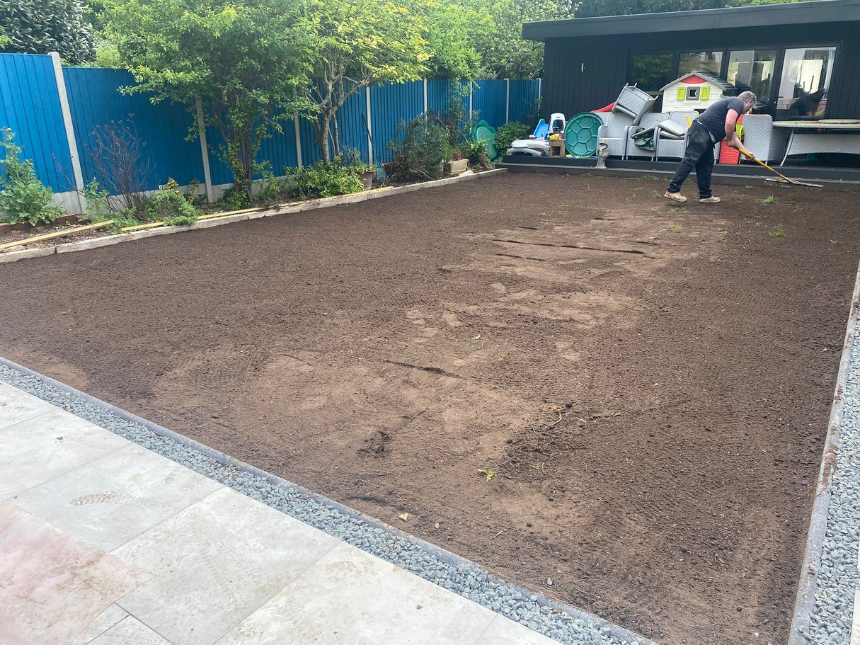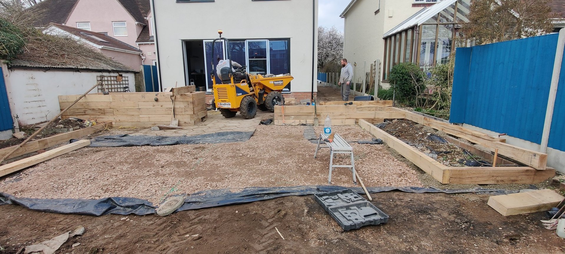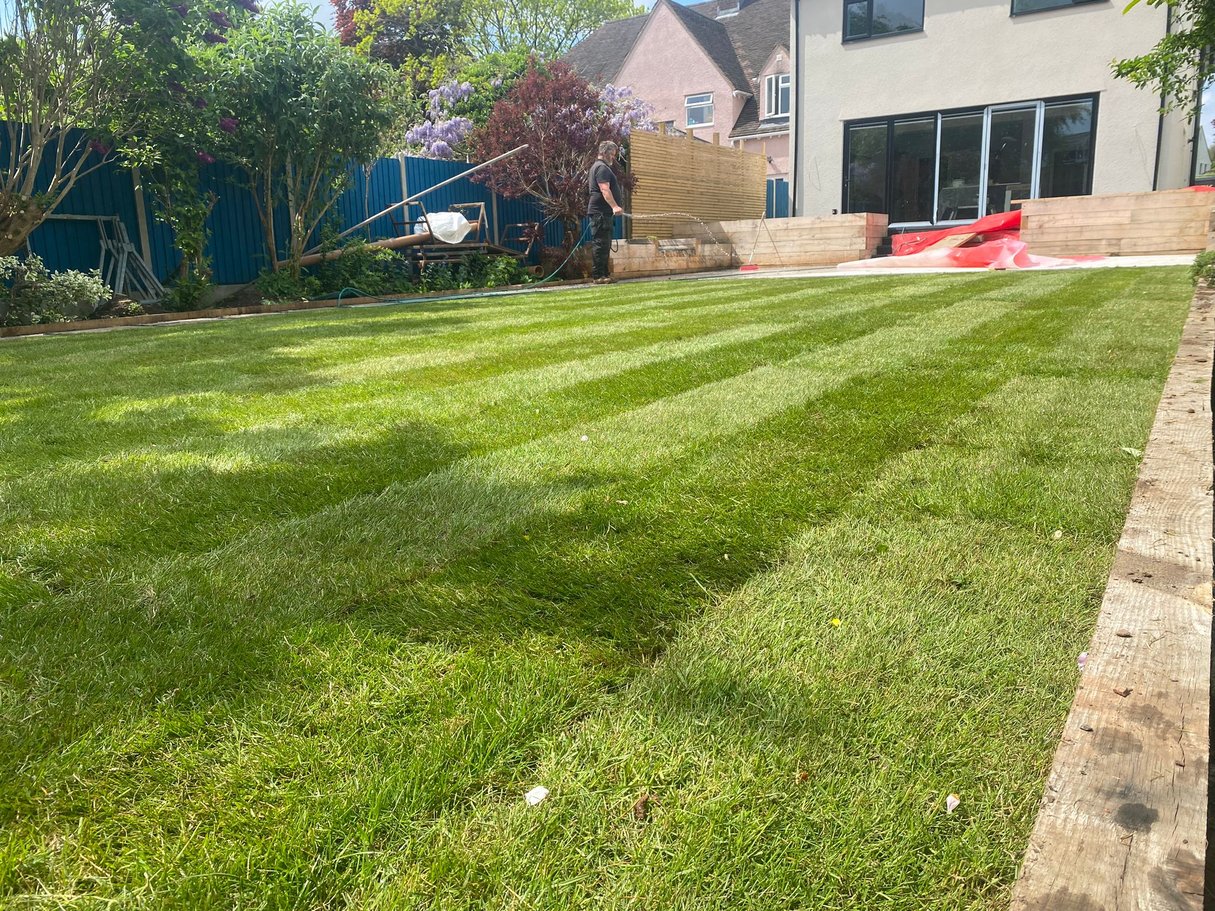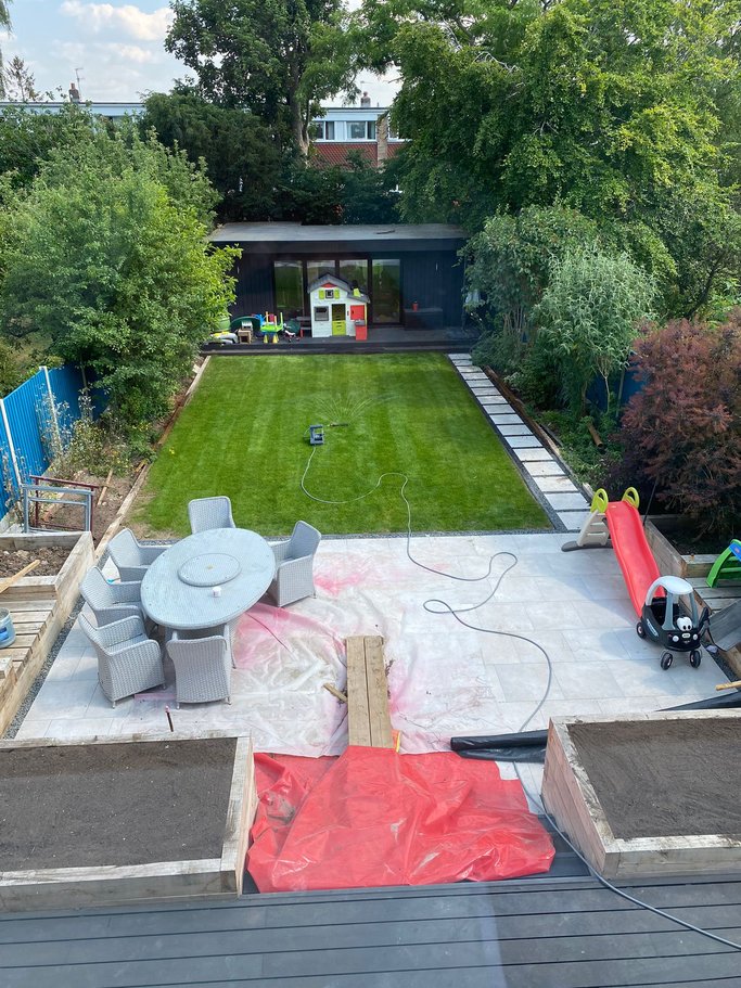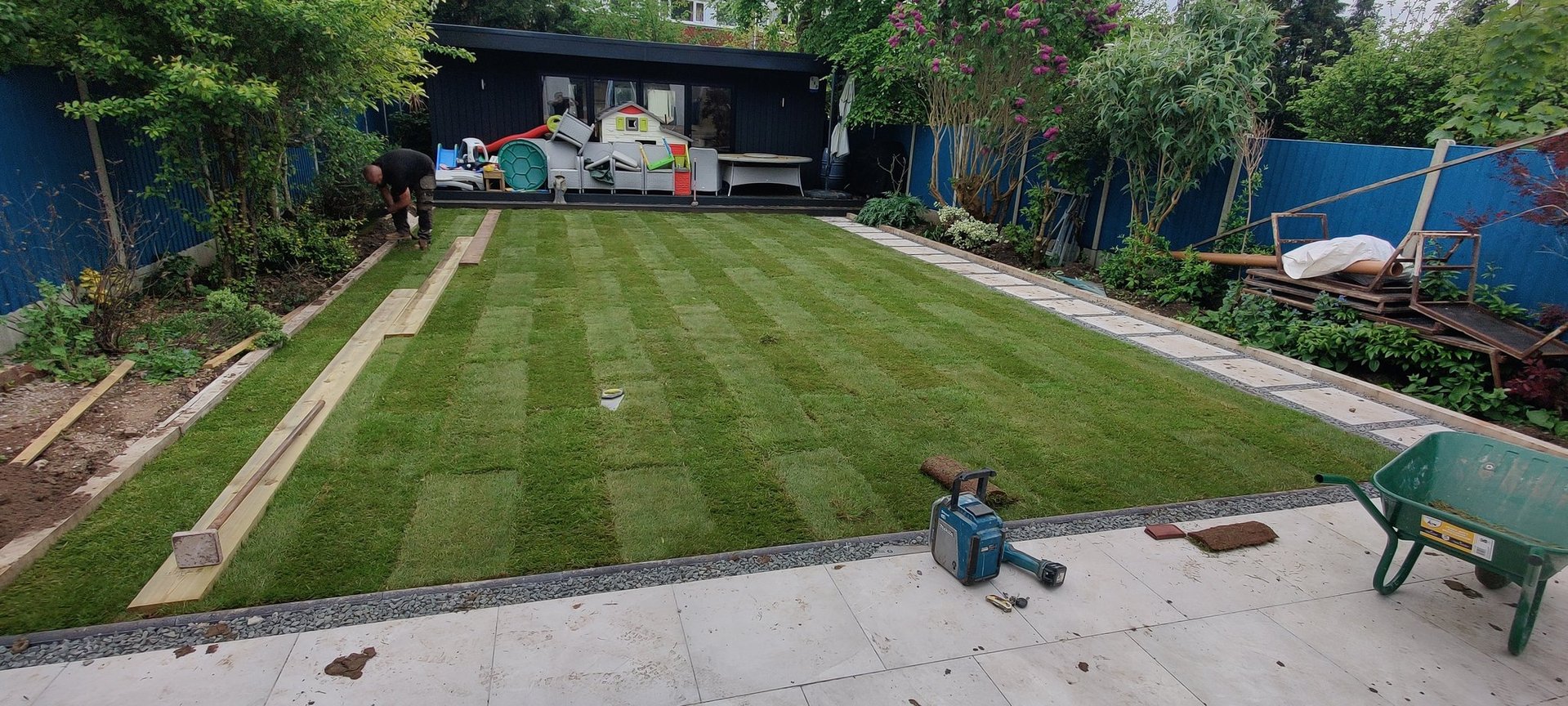 An attractive, generous patio space was expertly prepared alongside a functional footpath, both defined by professional path edgings and bordered with robust oak sleepers that tie the design elements together. The garden was carefully levelled to create a smooth, usable lawn area perfect for family activities, establishing one fluid level that makes the space feel larger and more cohesive.