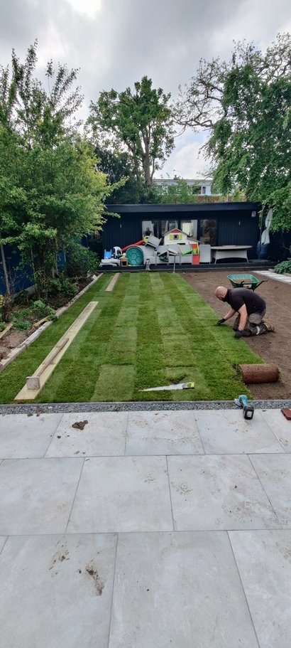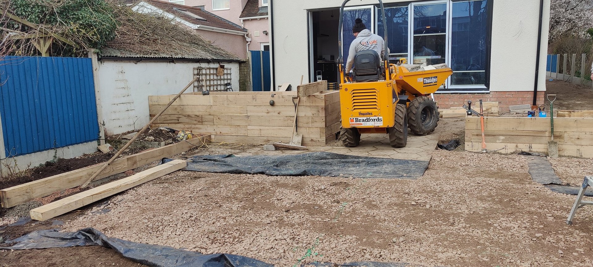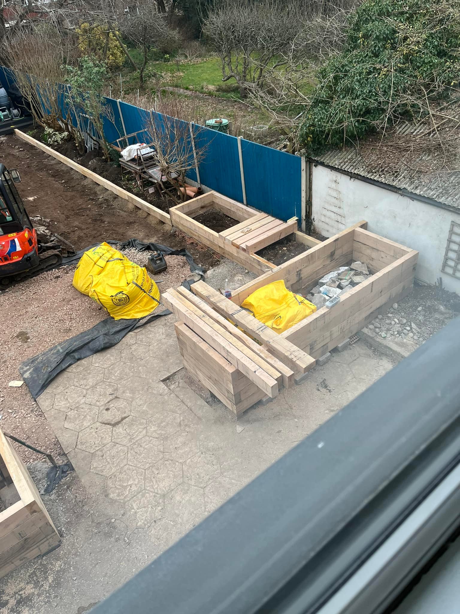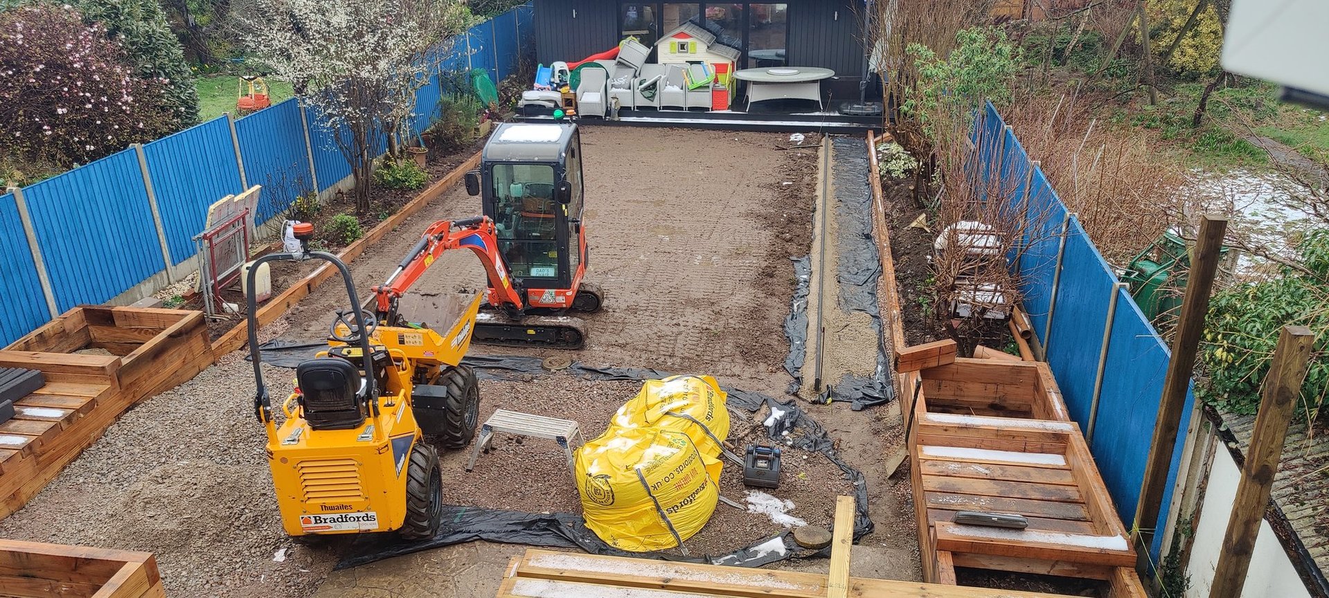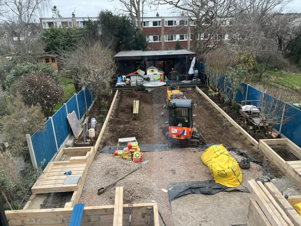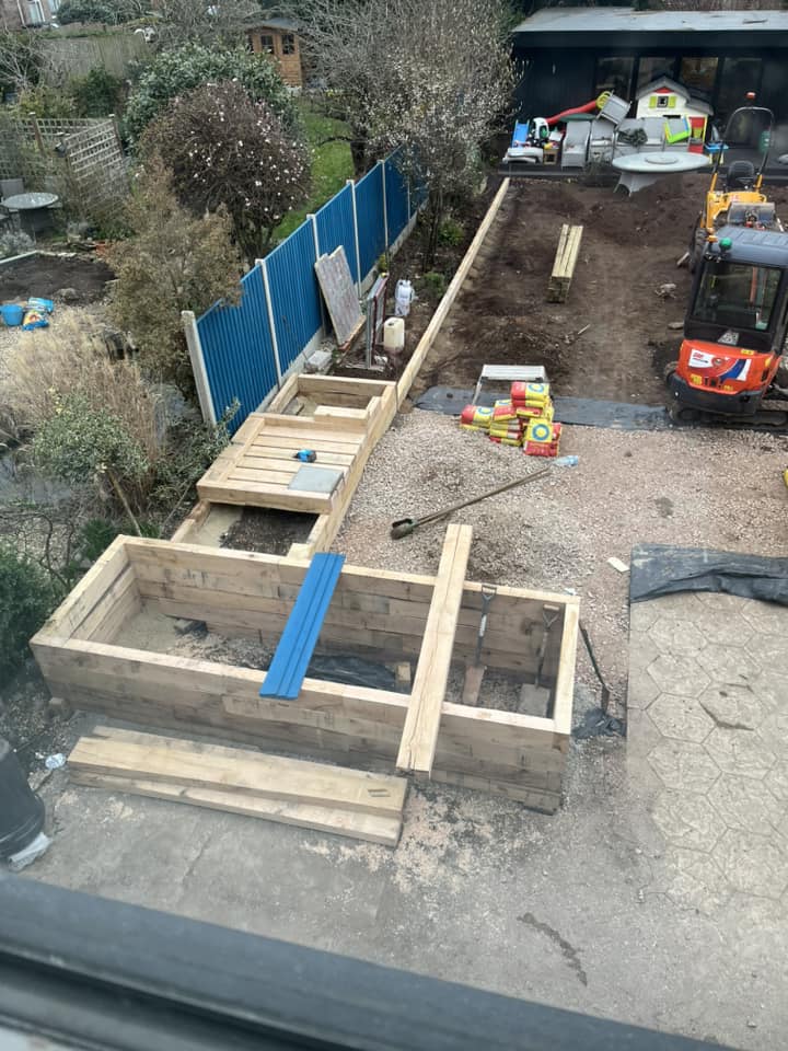 An attractive, generous patio space was expertly prepared alongside a functional footpath, both defined by professional path edgings and bordered with robust oak sleepers that tie the design elements together. The garden was carefully levelled to create a smooth, usable lawn area perfect for family activities, establishing one fluid level that makes the space feel larger and more cohesive.