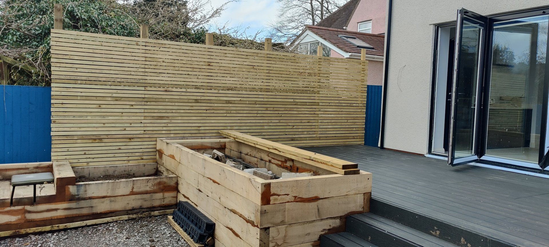 Working alongside the principal contractor, we delivered a multi-faceted landscape transformation. The centrepiece is an expansive composite decking area that provides low-maintenance outdoor living space ideal for furniture and entertaining. Complementing this, we constructed substantial oak sleeper raised beds that serve a dual purpose—attractive planting areas that double as integrated seating for lounging, a clever design solution maximizing both aesthetics and functionality.