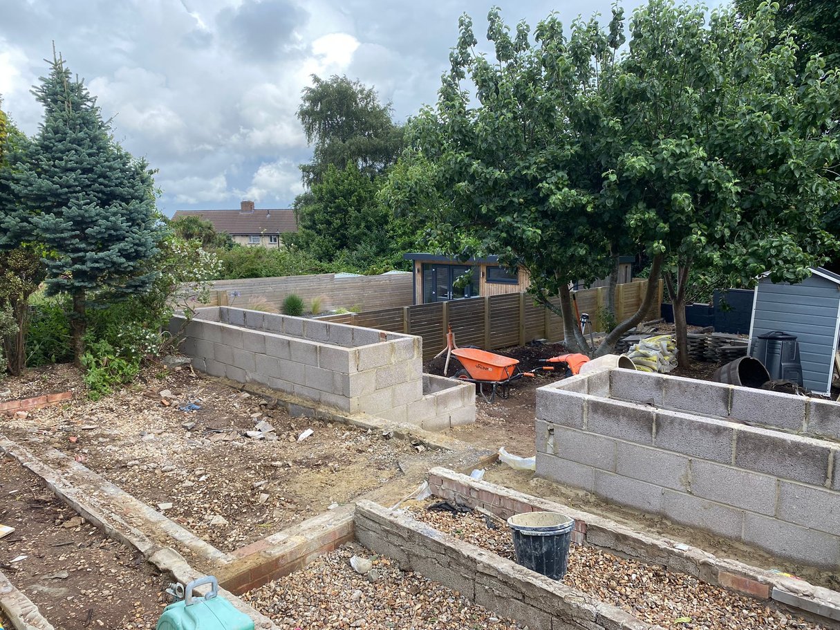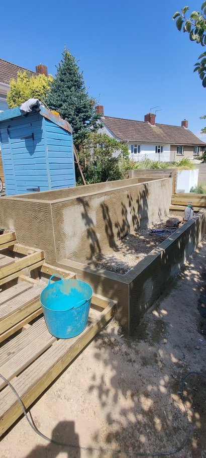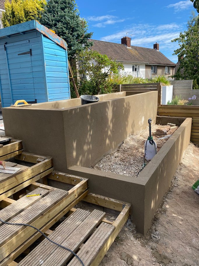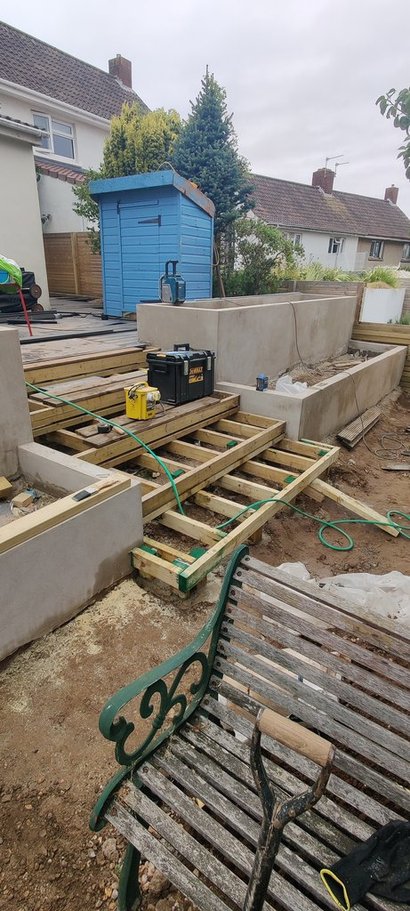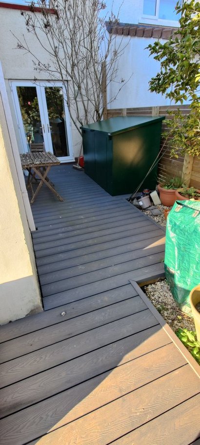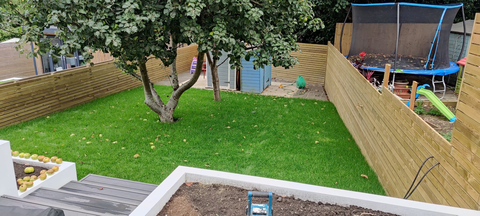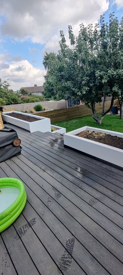 The upper level features a generous composite decking area with integrated retaining wall planters, providing both seating opportunities and planting space. This steps down to a new lawned area perfect for relaxation and play, which transitions to a prepared slabbed section—infrastructure already in place for a future garden room including power and data cable installation.