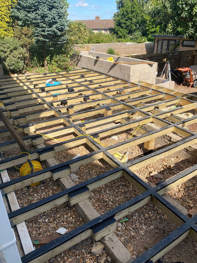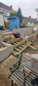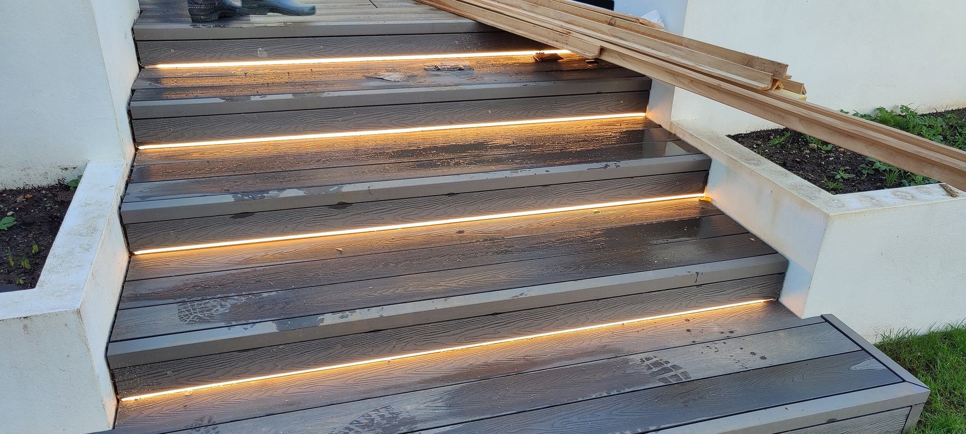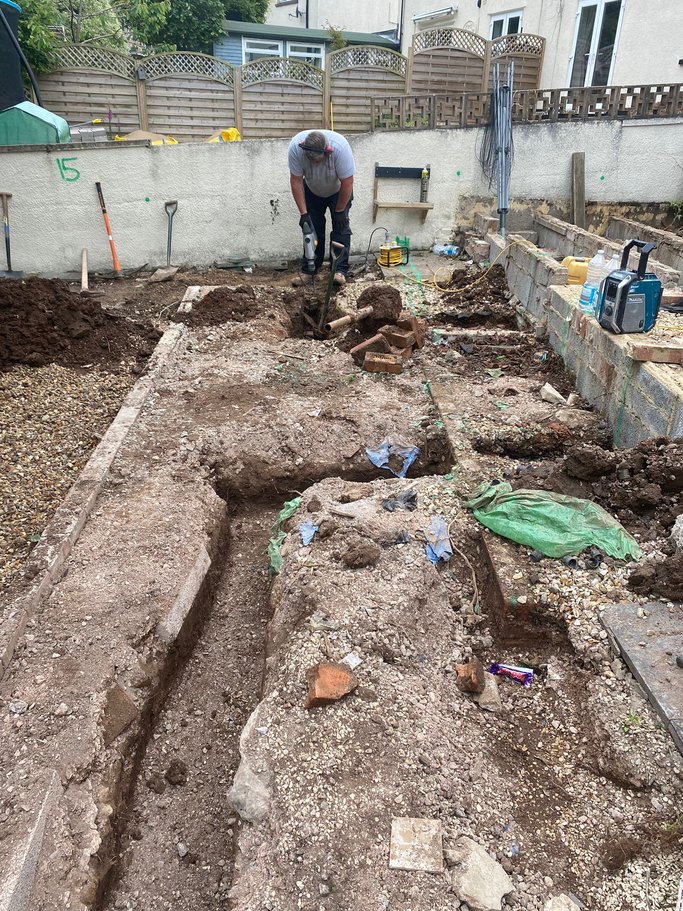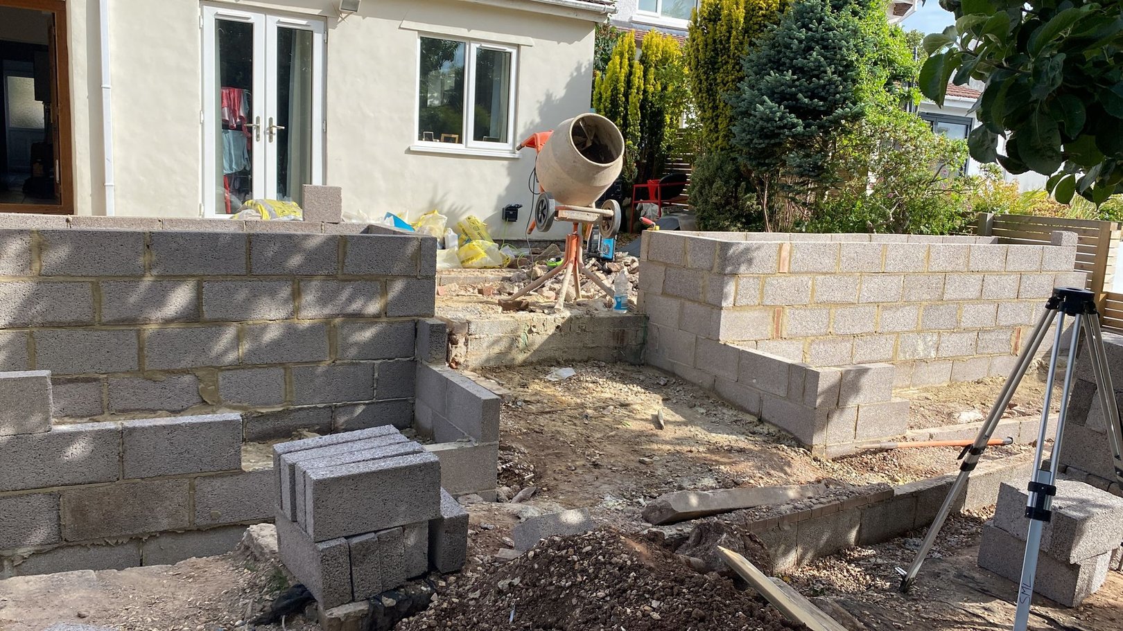 The upper level features a generous composite decking area with integrated retaining wall planters, providing both seating opportunities and planting space. This steps down to a new lawned area perfect for relaxation and play, which transitions to a prepared slabbed section—infrastructure already in place for a future garden room including power and data cable installation.