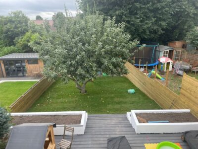 Practical improvements included installing water points halfway down the garden for convenient irrigation. The entire garden was enclosed with attractive slatted fencing, providing privacy whilst maintaining airflow. The future-proofed design demonstrates our forward-thinking approach, ensuring the garden can evolve with the family’s changing needs whilst maintaining a cohesive aesthetic throughout.