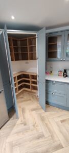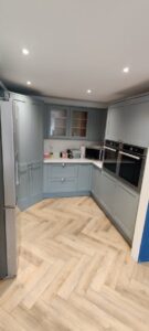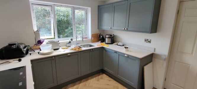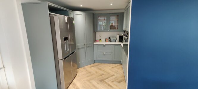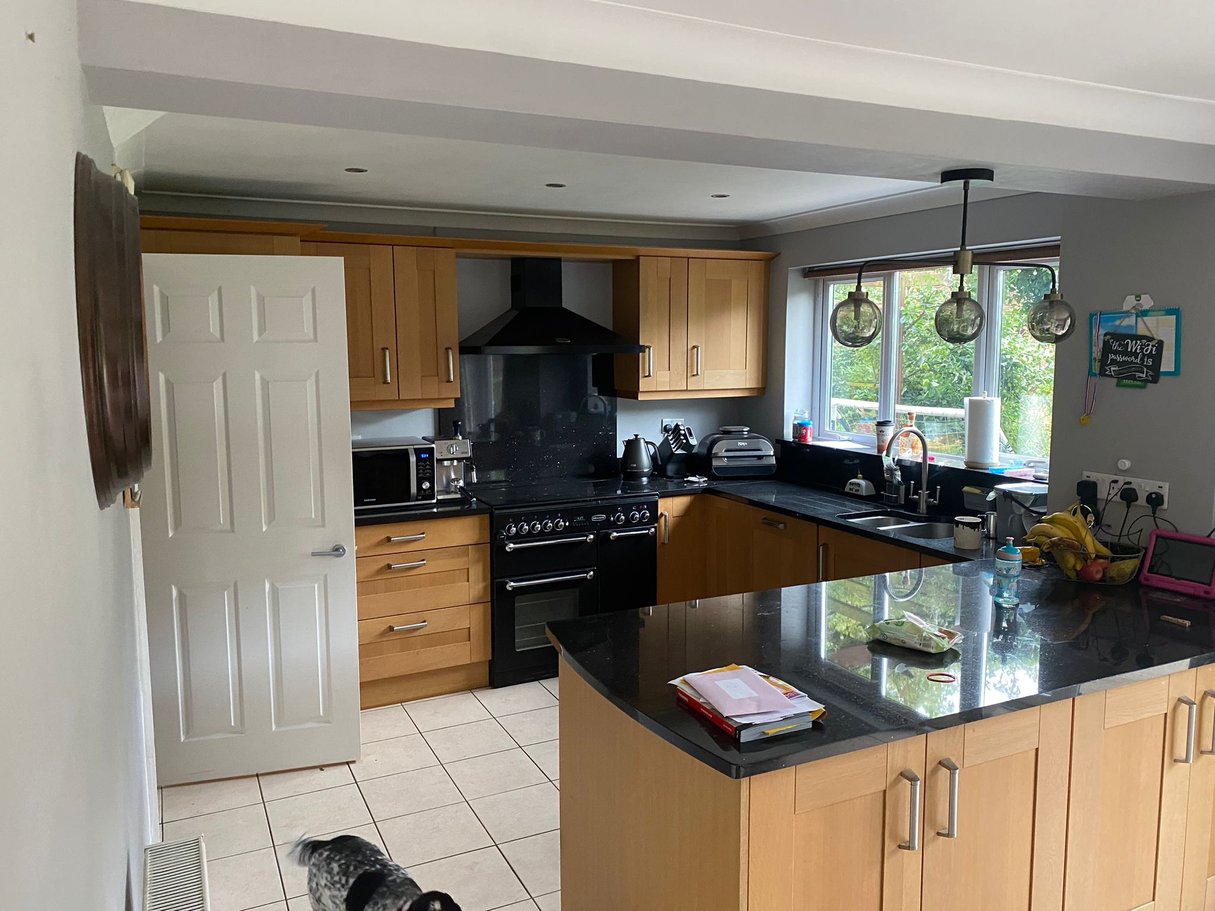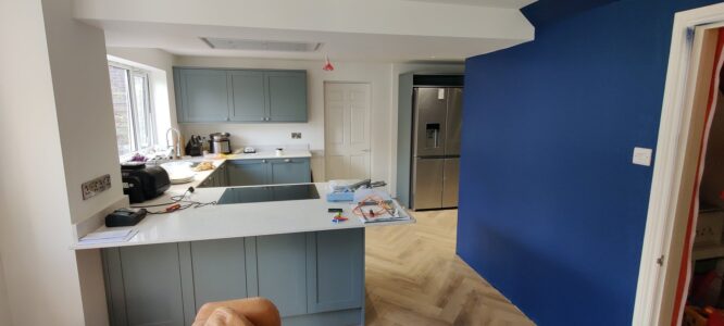 External modifications included blocking up an existing patio door with precisely matched brickwork and creating a new window opening in its place, improving both the room’s proportions and natural light distribution. The project culminated in installing a stunning new kitchen featuring a walk-in larder, double ovens, and integrated appliances—a spacious, functional cooking and entertaining space that perfectly realized the client’s vision for modern family living.