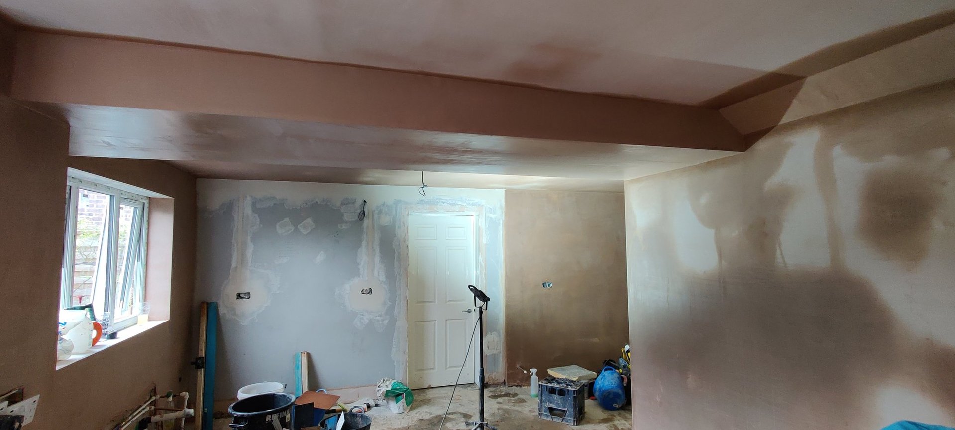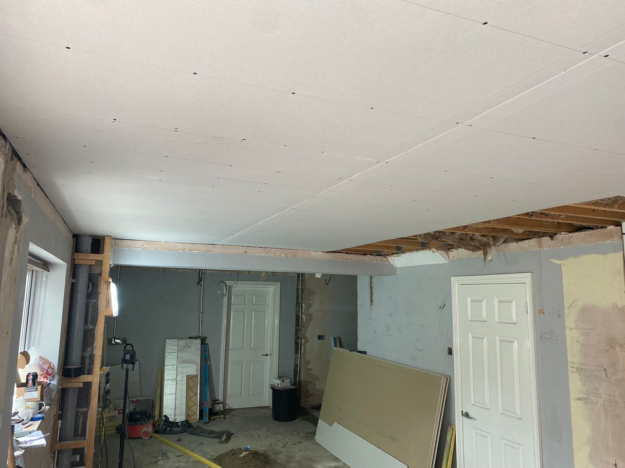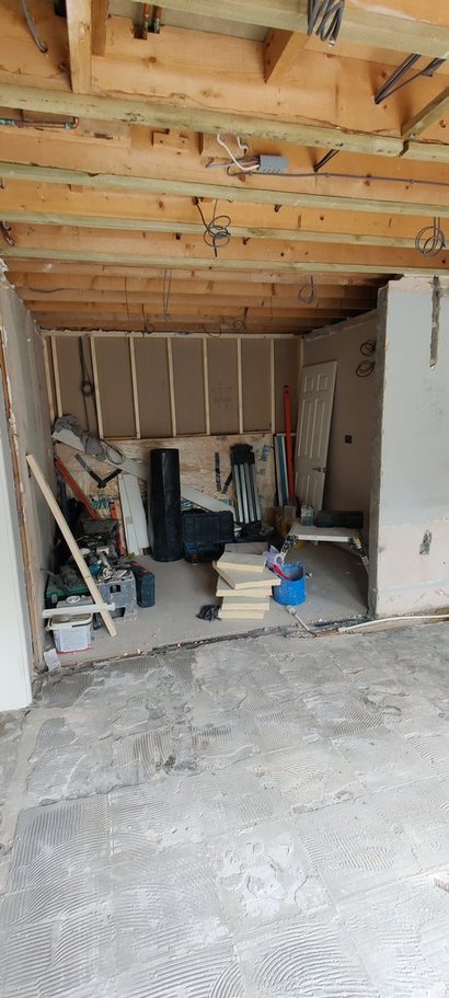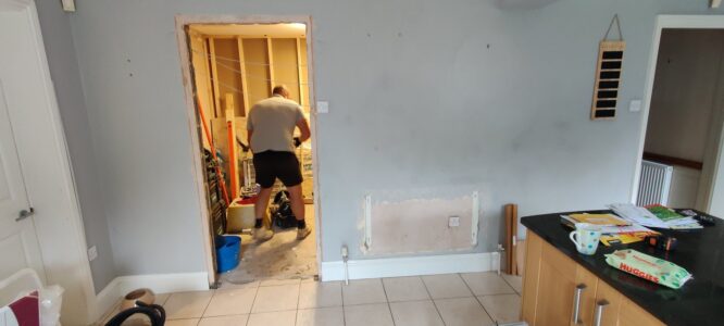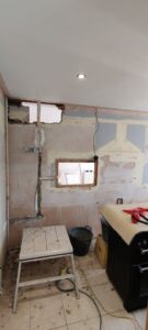 The structural work was extensive: redirecting gas and water services to accommodate the new layout, demolishing multiple walls to open up the space, and removing ceilings to update all electrical installations to modern standards. A particular challenge was addressing floor level discrepancies revealed when walls were removed—our team expertly levelled the entire floor to create the seamless, flowing finish the client desired for their new flooring installation.