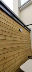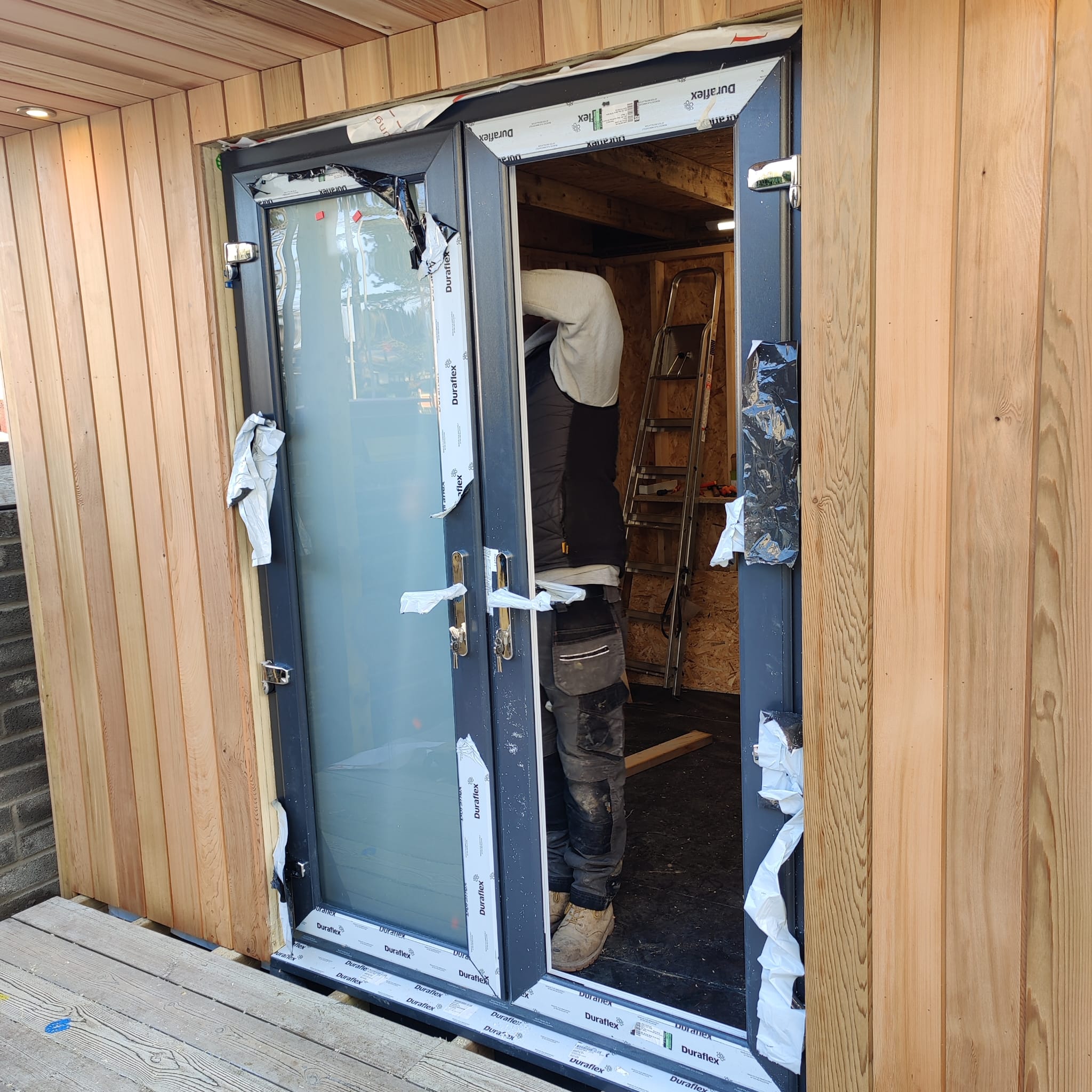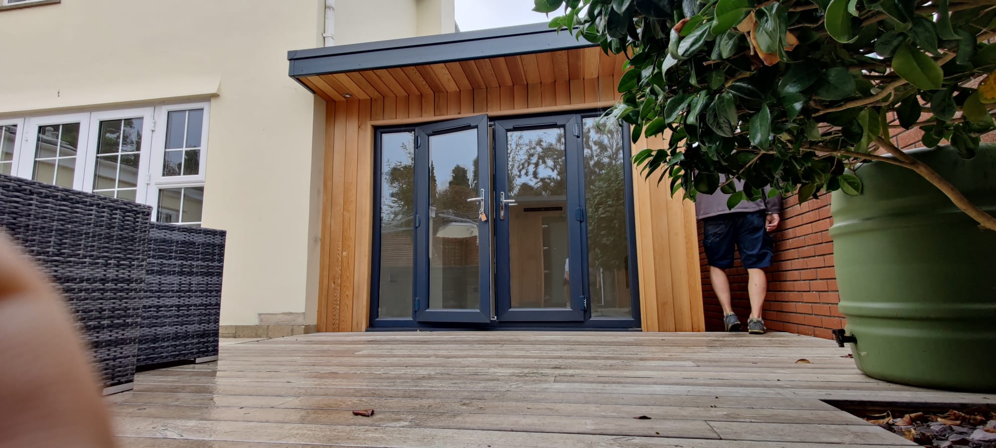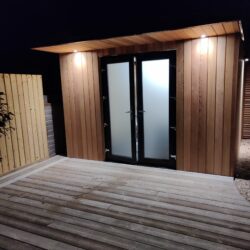 Impressed by the quality and attention to detail, our client commissioned a companion side room designed for use as an office and entertaining space. This fully insulated building matched the shed’s high-specification finish with Canadian cedar cladding, but elevated the interior with full plastering and professional decoration. A large patio door flanked by full-height side panels creates a light-filled space that seamlessly connects with the garden.