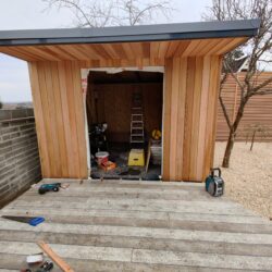 What began as a commission for an exceptional garden shed evolved into a two-phase project showcasing TIMARK’s craftsmanship in bespoke garden buildings. The initial shed was hand-built to client specifications, featuring a durable single-ply roof system, attractive patio doors for natural light and garden access, and beautiful Canadian cedar cladding that weathers naturally whilst requiring minimal maintenance. Power installation ensured the shed could serve multiple purposes beyond simple storage.