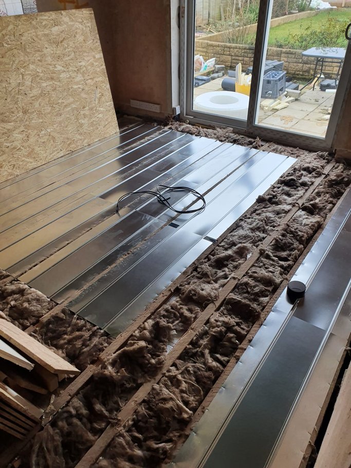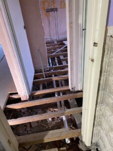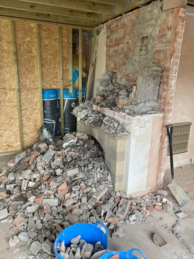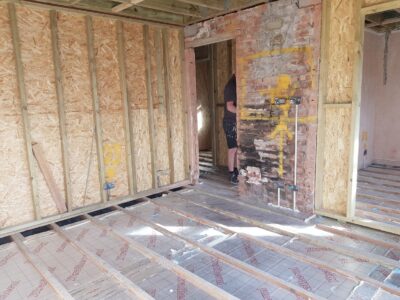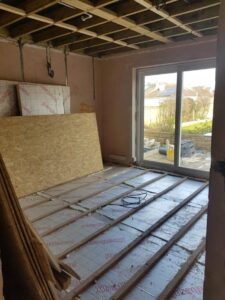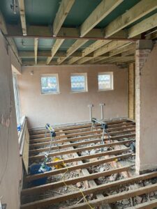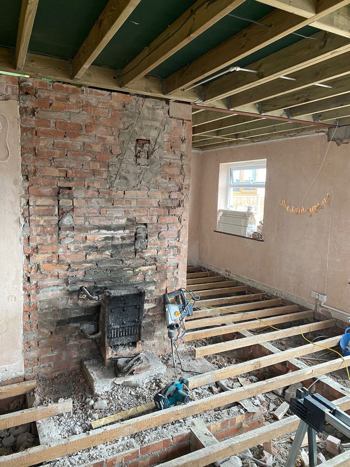 Ground floor transformation involved creating new doorway openings whilst blocking up redundant ones to improve traffic flow. We dismantled an old chimney, reclaiming valuable space and modernizing the interior. All floorboards were lifted to install comprehensive insulation in preparation for an underfloor heating system, significantly improving energy efficiency and comfort.