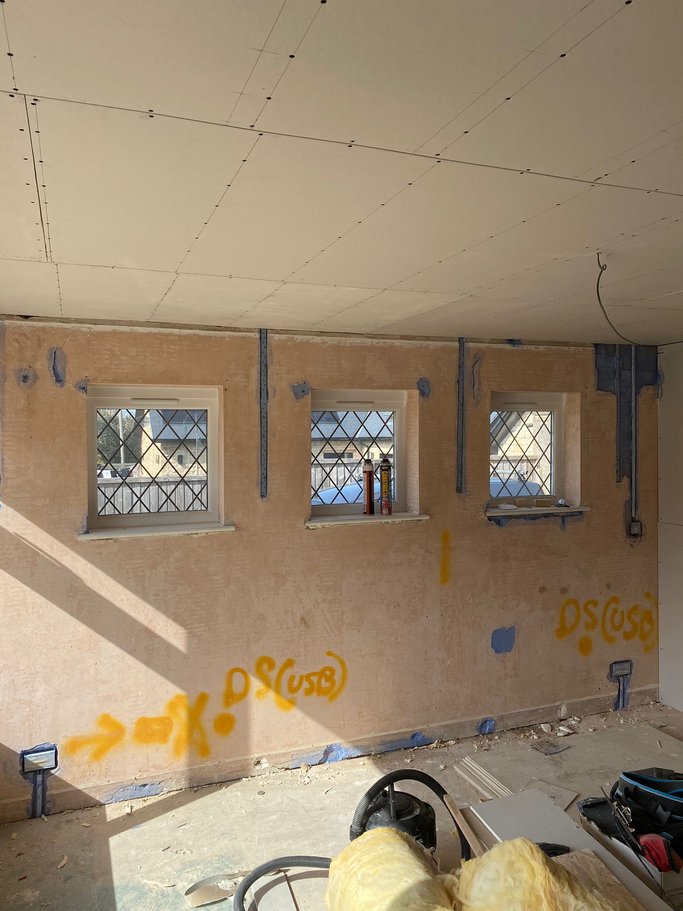 Our team completed all chasing work for the new electrical installation, ensuring cables were properly concealed whilst maintaining structural integrity. The culmination was re-plastering the entire ground floor, creating smooth, contemporary surfaces throughout. This project demonstrates our expertise in managing phased renovations that allow clients to remain in occupation whilst their home undergoes dramatic transformation.