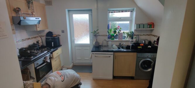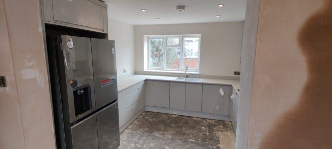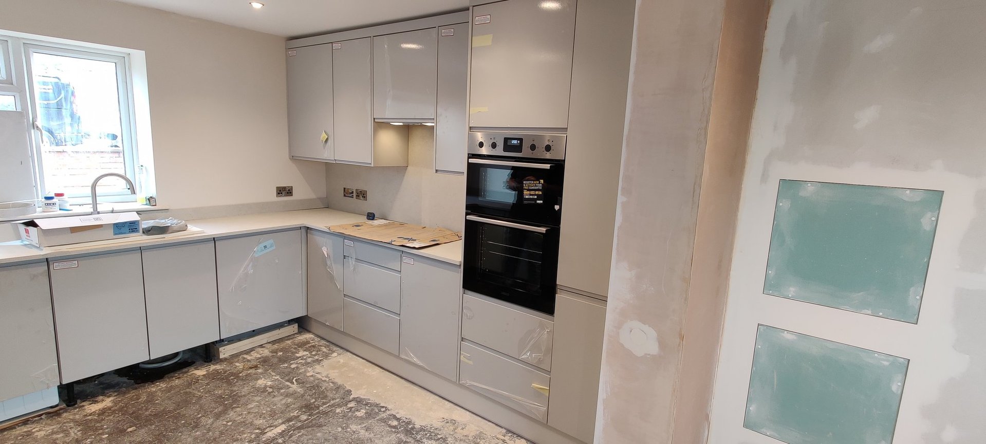 The project culminated with installing a complete new kitchen with integrated appliances and comprehensively rewiring the entire open-plan area to support the new layout. The result transformed an impractical floor plan into a contemporary, user-friendly kitchen-diner that’s become the heart of the home.
