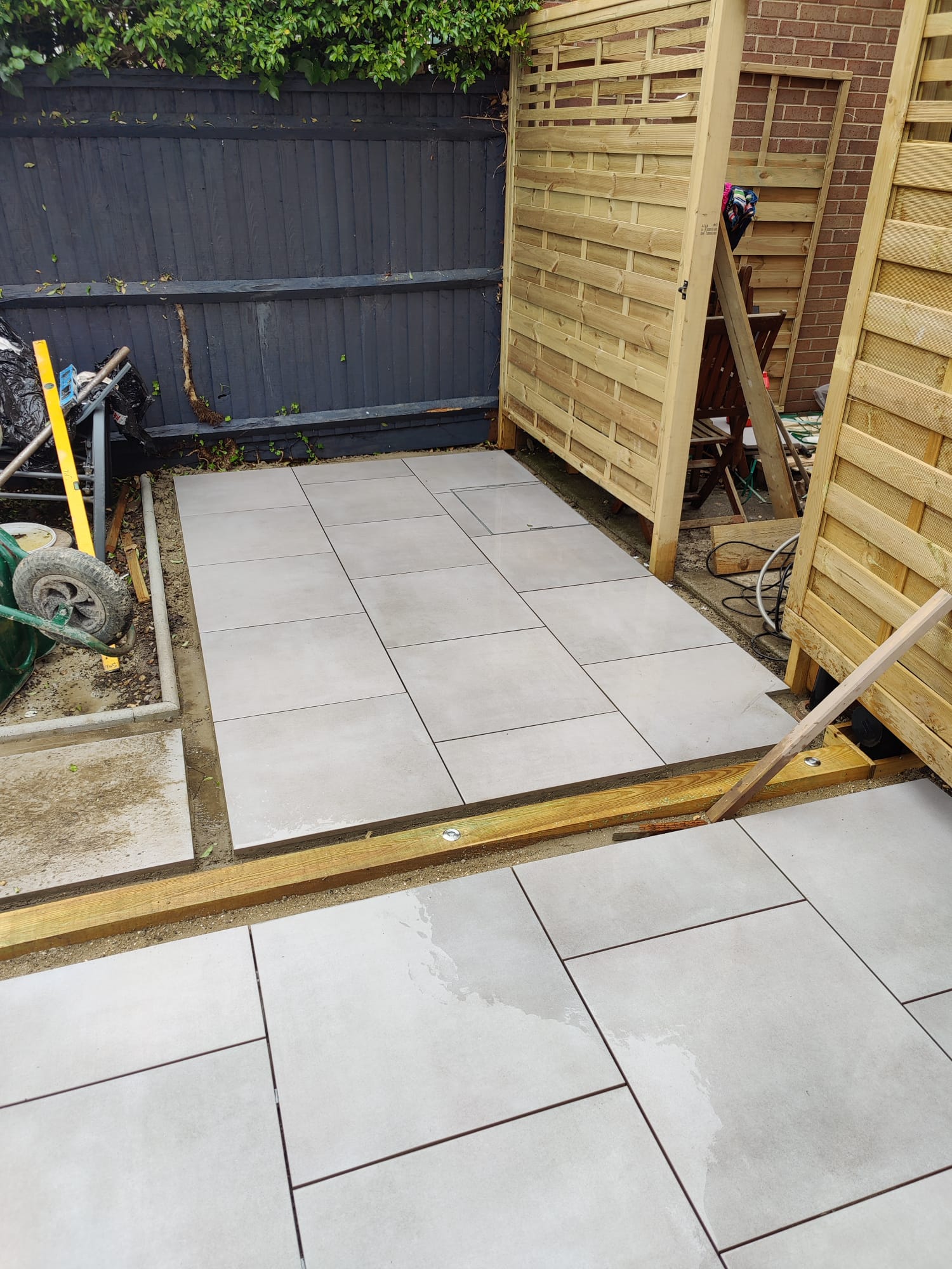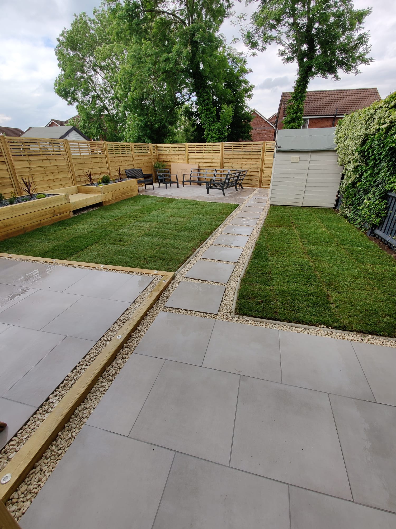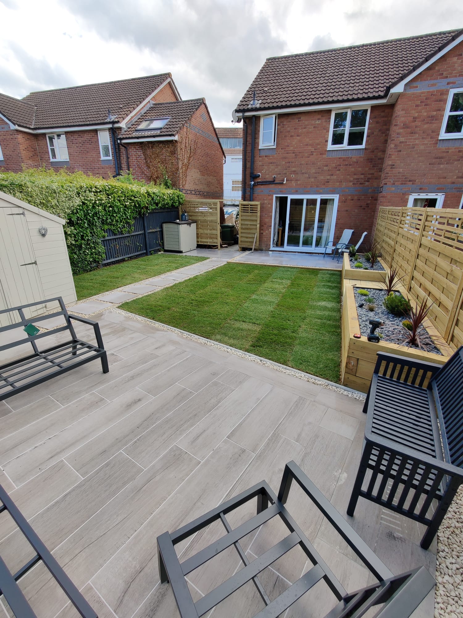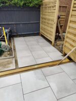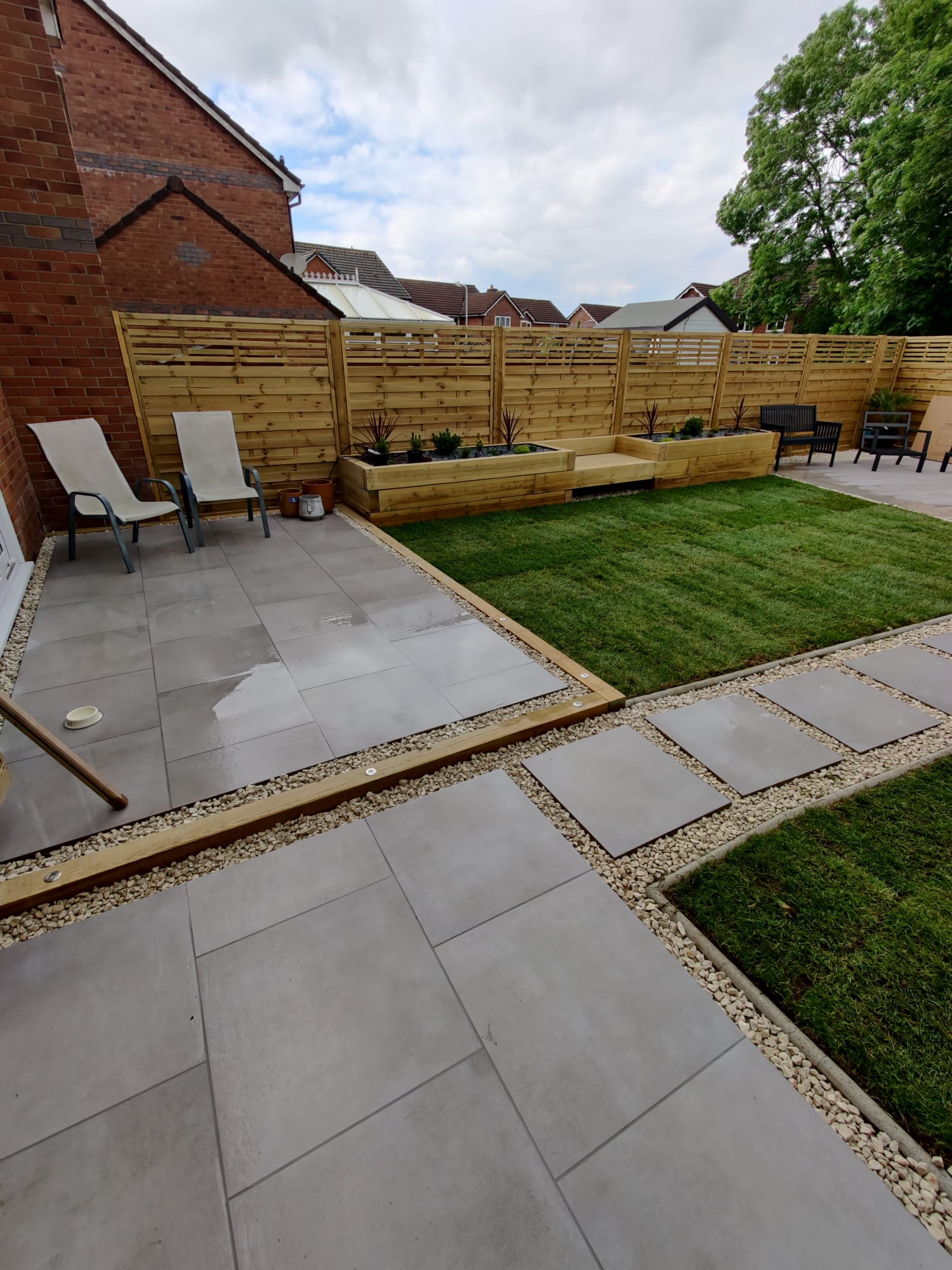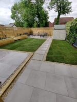 New perimeter fencing and an entrance gate completed the transformation, providing privacy and security whilst defining the garden’s renewed character. The dual-patio design ensures the family can follow the sun throughout the day, maximizing their enjoyment of the outdoor space from morning through sunset.