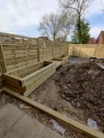 Raised beds constructed from robust timber sleepers add architectural interest whilst doubling as informal perimeter seating—a practical solution that enhances both form and function. Through clever retaining of the rear garden section, we created additional usable space for a secondary patio area perfectly positioned to capture the evening sun.